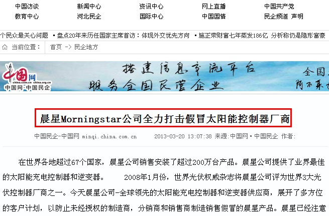 (中國網:晨星Morningstar公司全力打擊假冒太陽能控制器廠商 ) 中電日晟